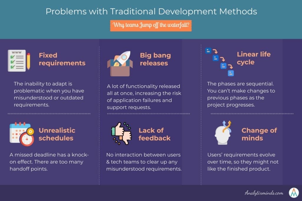 Waterfall methodology is inherently negative toward requirements changes. A business analyst creates a neatly drafted requirements document that goes to the developers. It usually has bloated or nice-to-have requirements because they know adding or changing them later is complicated and expensive. It is common for projects to go over budget and schedule.